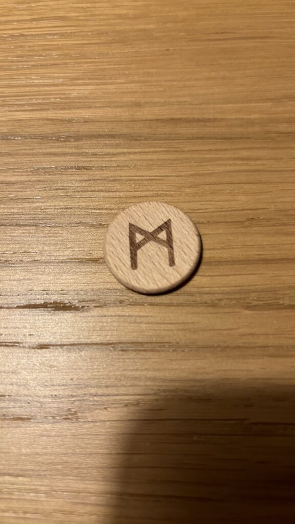 Hierdoor wordt de rune centraal op de schijf gebrand. Na de eerste keer dat Mannaz op een schijf was gebrand, zijn de afstanden tot de rand opgemeten en zijn er kleine aanpassingen aan de spreadsheet aangebracht. Hierna is op de achterzijde de getoonde versie van Mannaz gebrand. Ik vind het er goed uit zien.