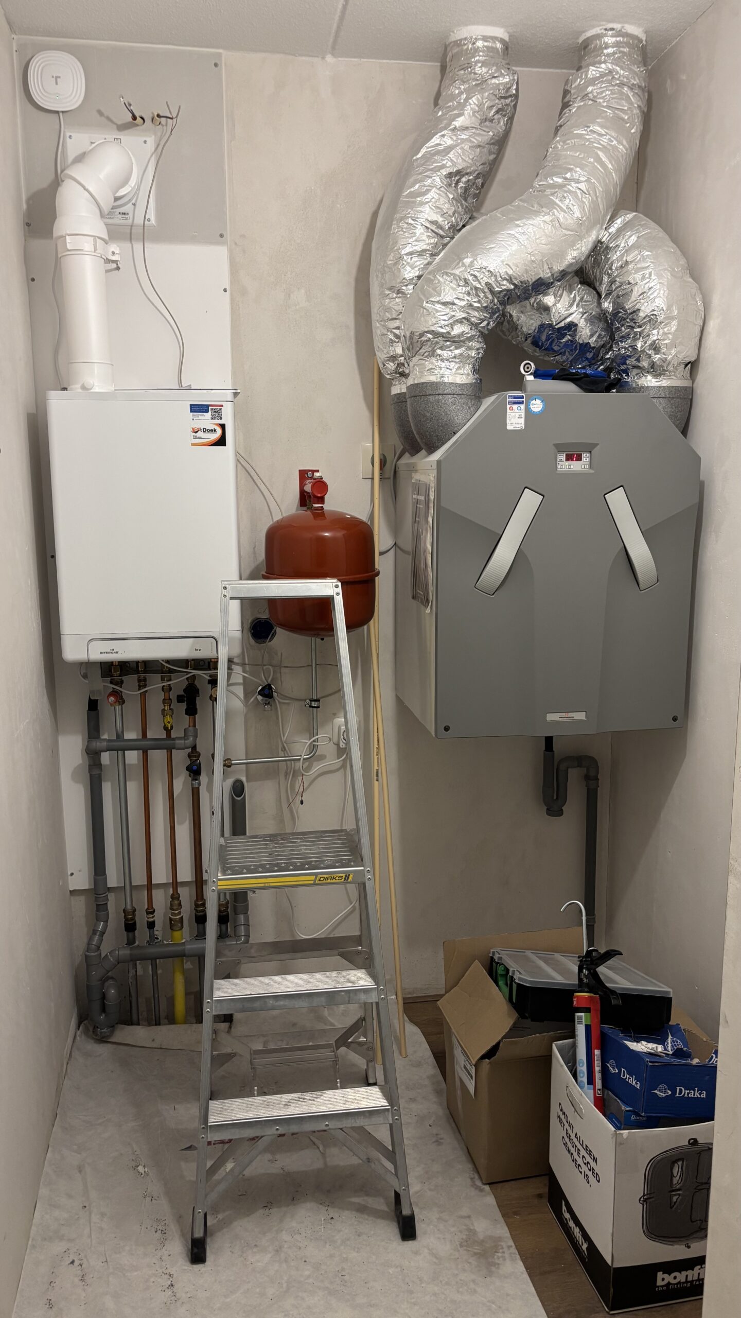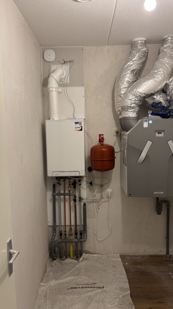 Daarna werd de ketel opgehangen en op de diverse leidingen aangesloten. Ook is er een nieuw expansievat geplaatst en is de rookgasafvoer aangesloten.