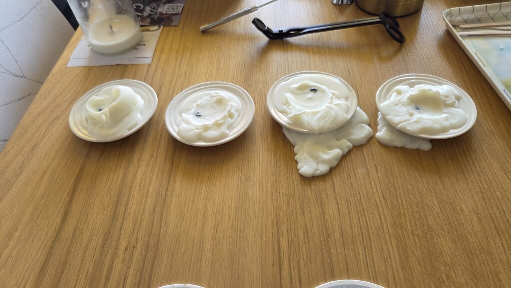 De brandduur van de kaarsen was korter dan het zou kunnen zijn, alle kaarsen hebben (behoorlijk) gelekt en daardoor is het lontje “verdronken”. Dit gebeurde het eerste bij het hartje (17 minuten) gevolgd door het roosje (42 minuten), de tulp (50 minuten) en de bijenkorf (50 minuten).