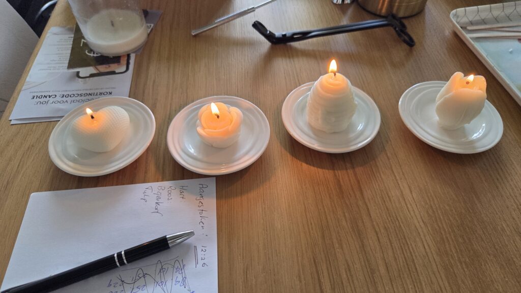 Het is altijd leuk om te weten hoe lang kaarsen branden. Daarom de vier gemaakte kaarsen aangestoken en de tijd genoteerd. Nu maar wachten totdat een kaars uit gaat en dan de tijd daarvan noteren. Kan je gelijk ook zien welke kaars mooi op brandt en welke “lekt”.