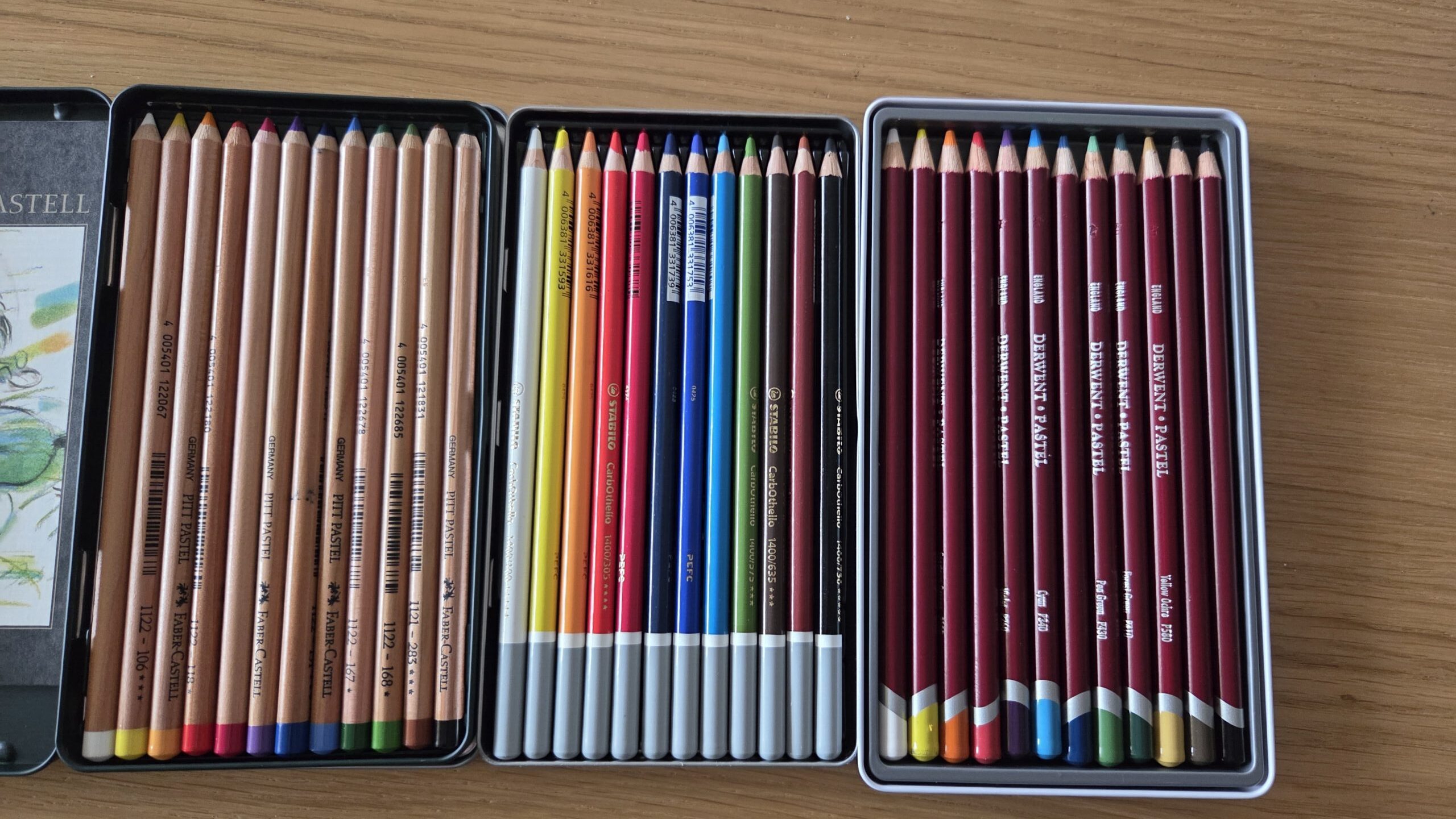 Zoals je op de bovenste foto kan zien heb ik momenteel drie kleine sets met pastelpotloden. Ik heb er namelijk ook nog een besteld bij bol.com en wel een Stabilo CarbOthello set. Deze is vanmiddag bezorgd. Dus tijd om een eerste vergelijking te maken tussen de drie merken.