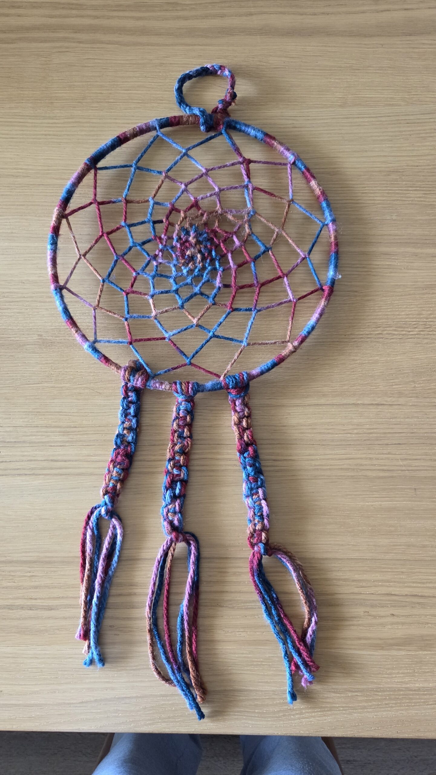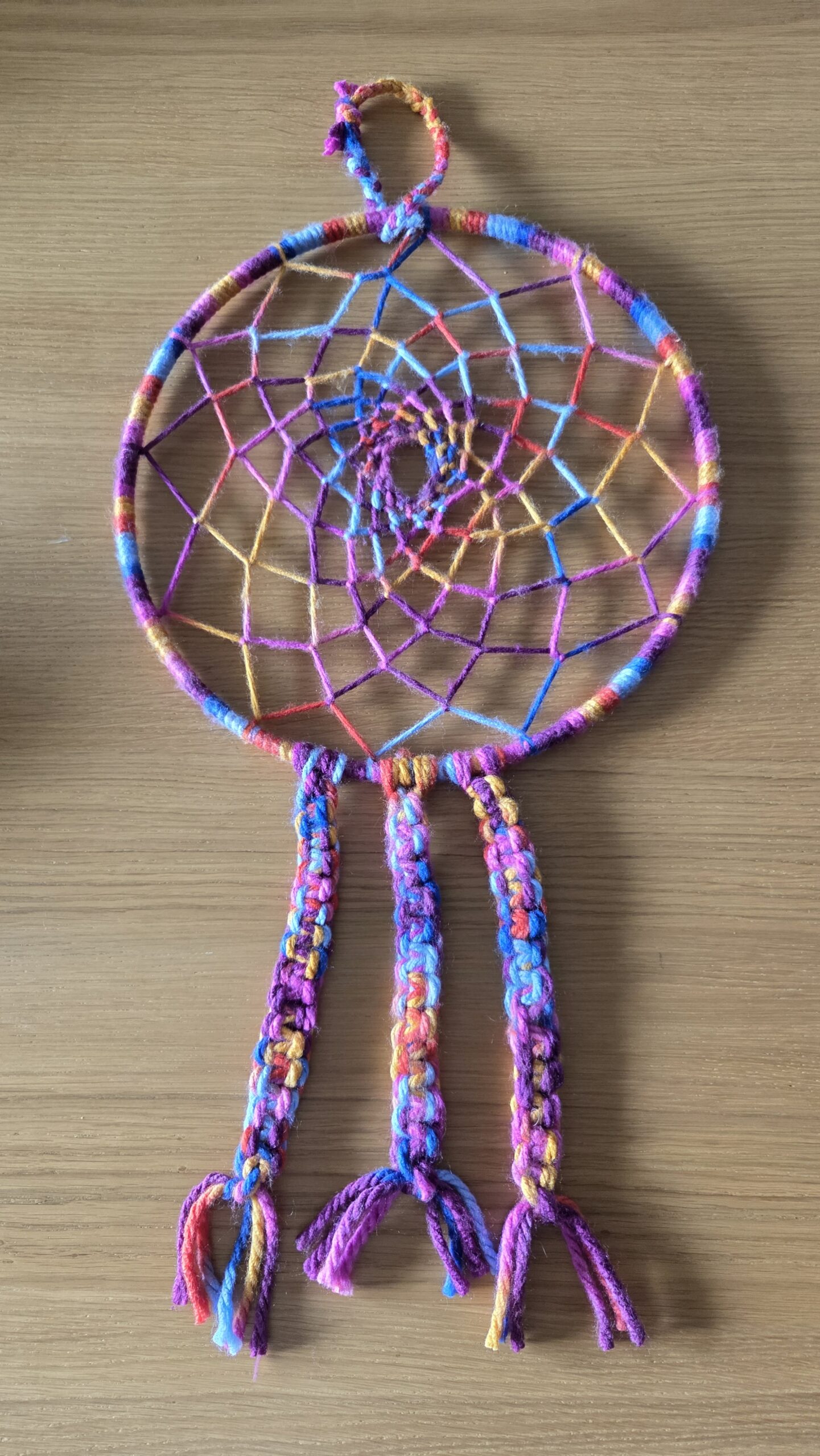 We hebben de smaak wel te pakken. Ik denk dat we nog een kleinere versie gaan maken met een dunner (wit) garen die we dan kunnen gaan versieren met kralen en veren en dergelijke. Die dromenvangers komen dan vermoedelijk boven onze bedden te hangen.