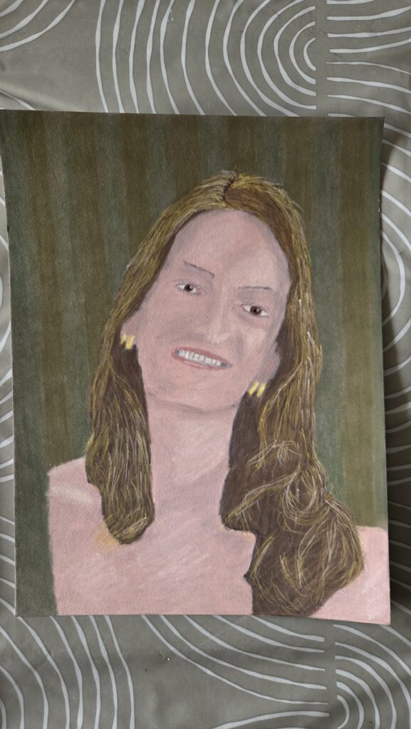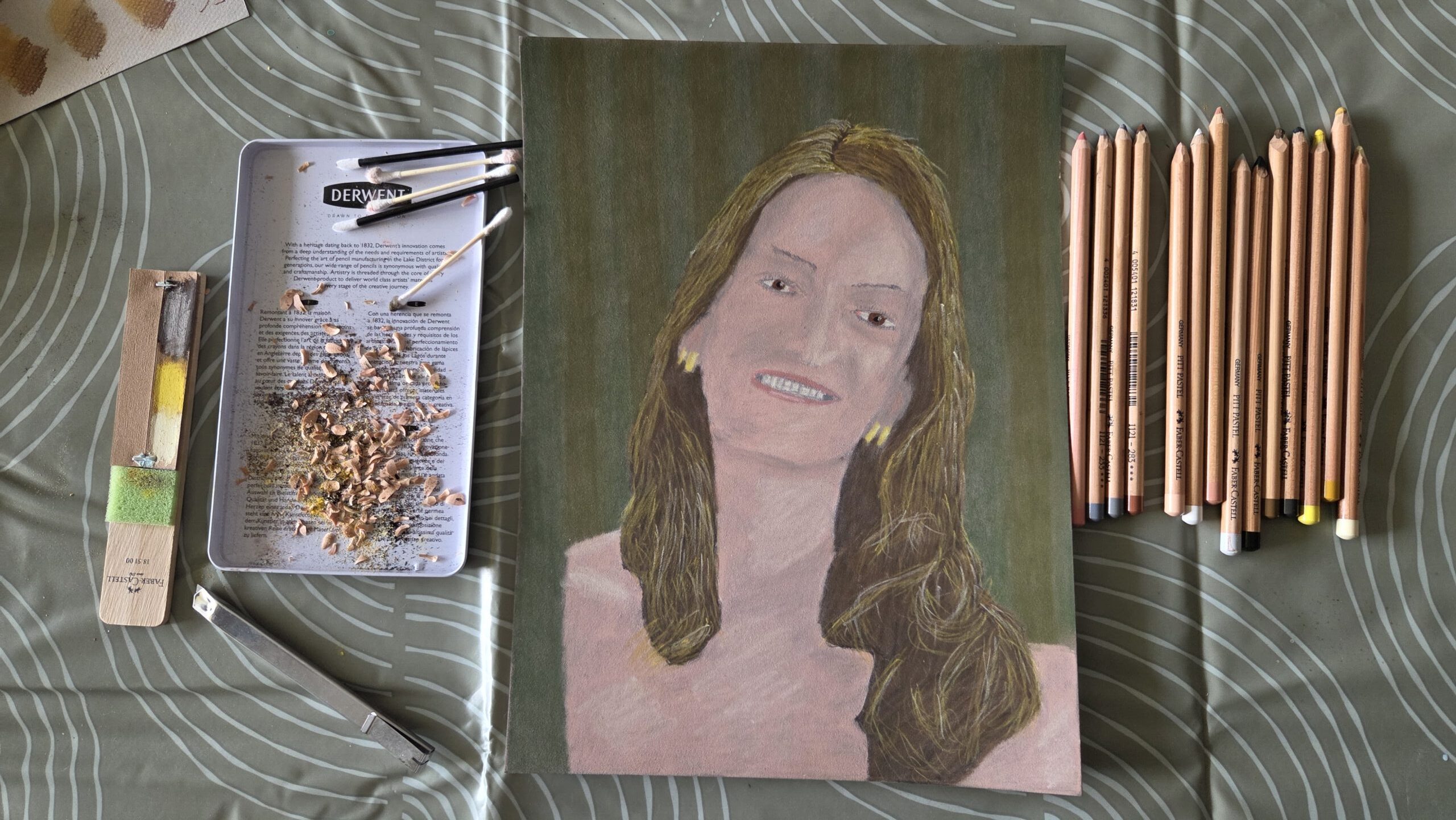 In totaal zijn er 14 kleuren gebruikt voor dit portret. Ook is er ervaring opgedaan met het slijpen van zowel het hout van het potlood als het pastelpotlood zelf. Om het stof en de schilfers op te vangen is gebruik gemaakt van het (losse) deksel van de Derwent potloden. Hierin zijn ook de diverse staafjes, waarmee het pastel werd gemengd, tijdelijk neergelegd. Bij het legen bleek dit blikje erg vervuild te zijn. Hier zal dus bij voorkeur een andere container, die simpeler is schoon te maken, voor gezocht moeten gaan worden.